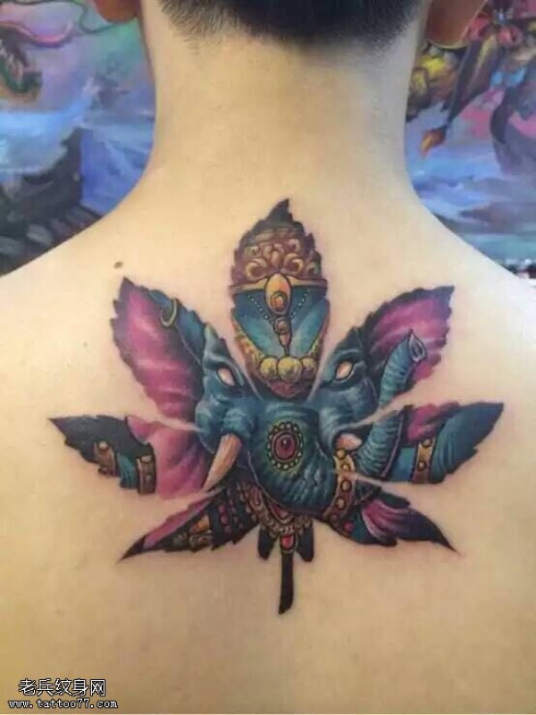 背部彩色大麻叶象神纹身图案