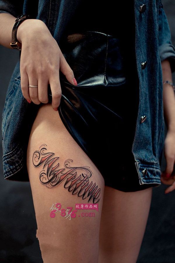 个性花体英文大腿纹身图片