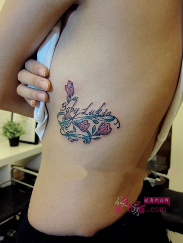 小清新玫瑰英文腰部纹身图片