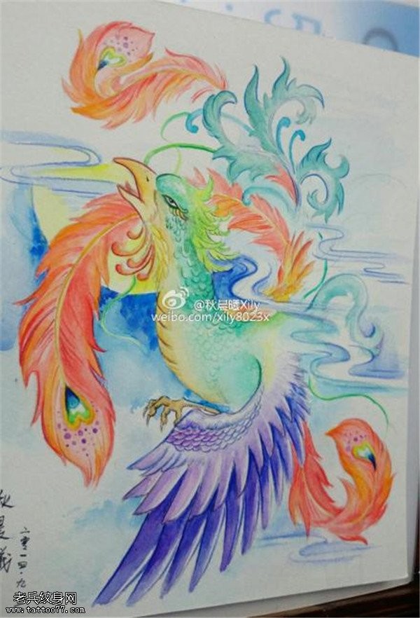 彩色凤凰纹身手稿图案