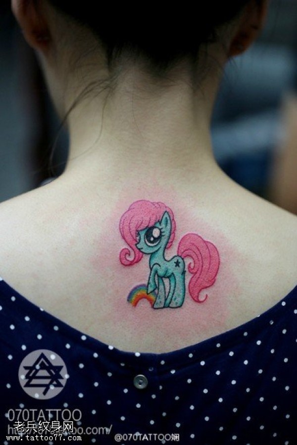女生背部彩色独角兽纹身图片