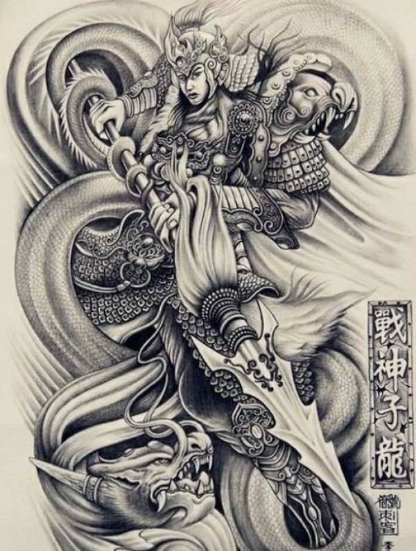 一张漂亮霸气的黑白战神子龙纹身手稿图片