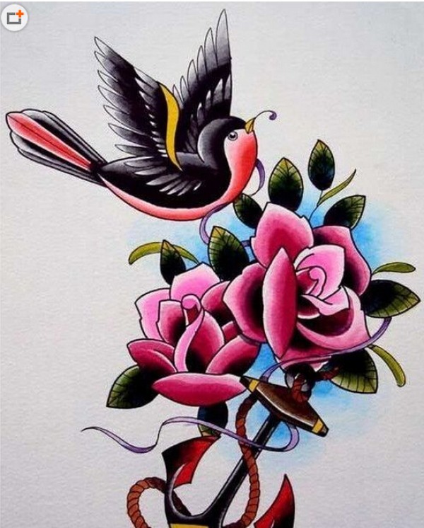 漂亮好看的彩色玫瑰花船锚燕子纹身手图片