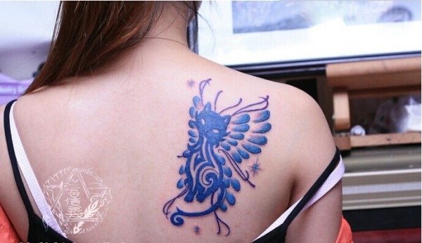 漂亮MM后背唯美好看的猫图腾纹身图片