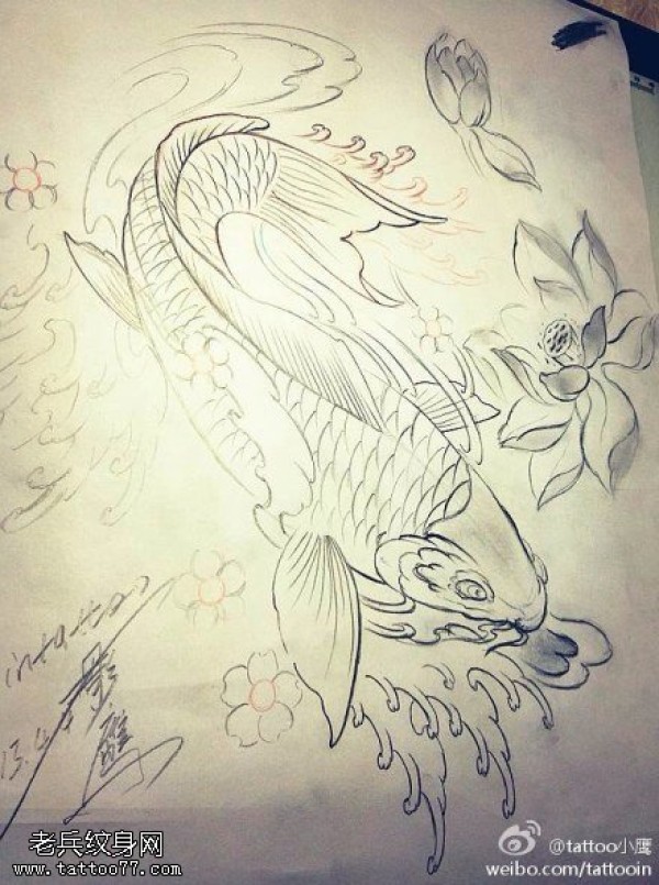 鲤鱼莲花线稿纹身图案