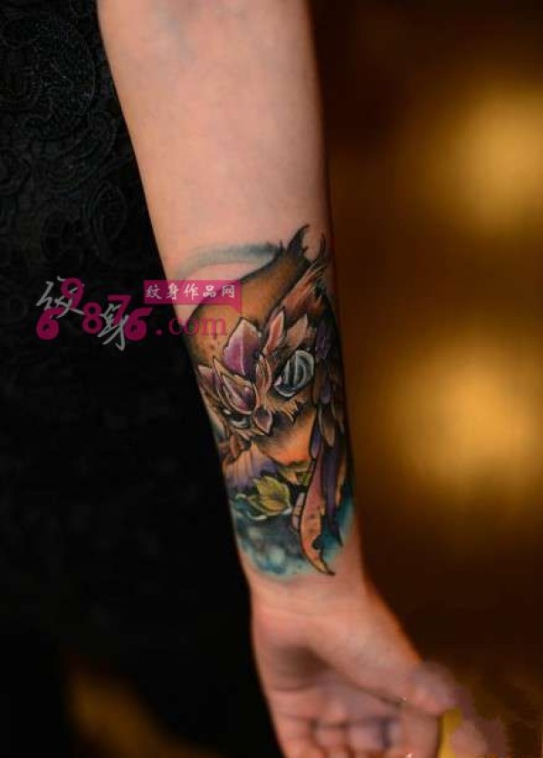 彩色猫头鹰手腕时尚纹身图片