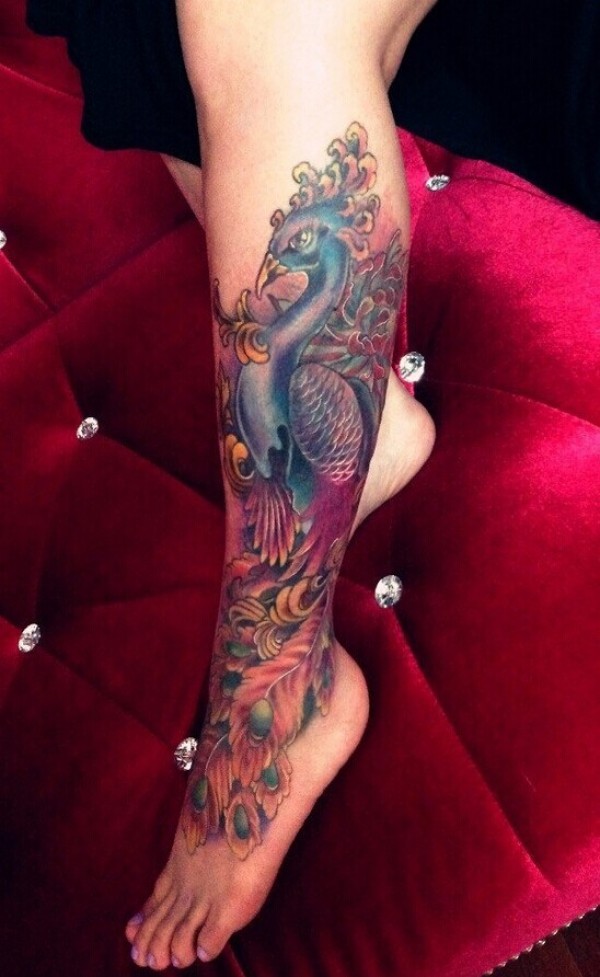 女生腿部彩色凤凰纹身图案