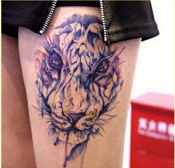 女生腿部个性泼墨老虎头纹身图案