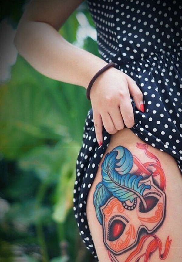 个性女生腿部时尚面具羽毛纹身图片图片
