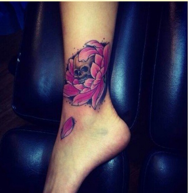 漂亮腿部个性彩色玫瑰骷髅纹身