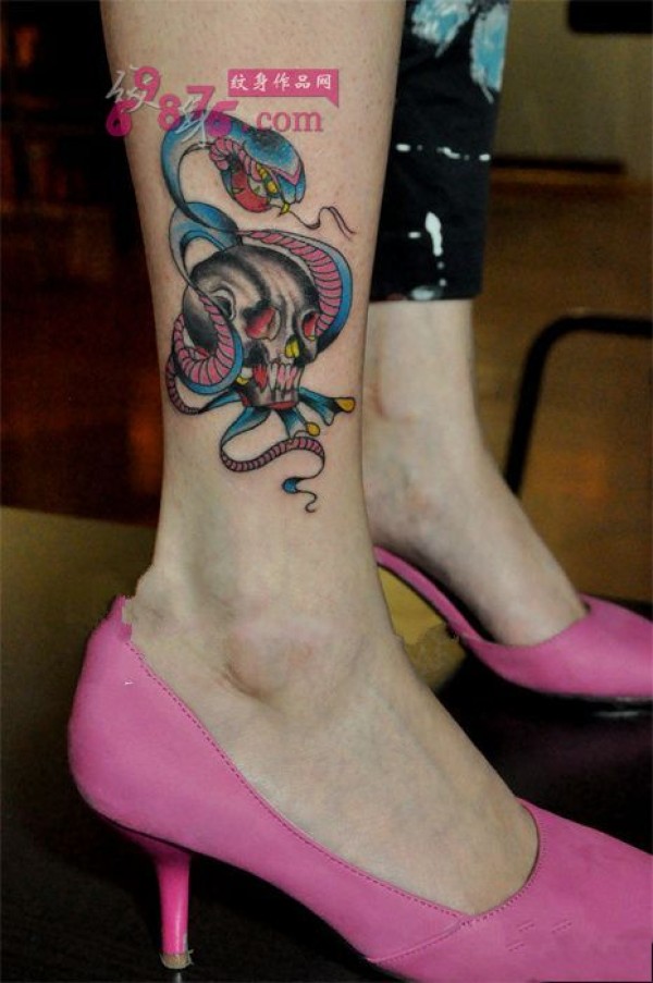蛇与骷髅脚踝个性纹身图片