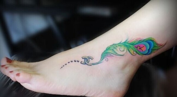 漂亮美女脚部精美的彩色羽毛纹身图案