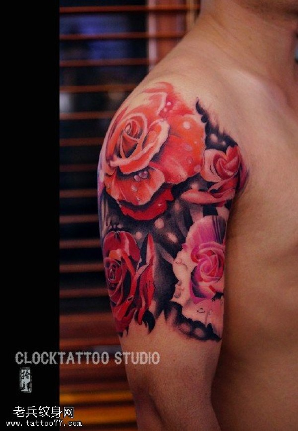 欧美玫瑰纹身 男生手臂上花朵纹身图片