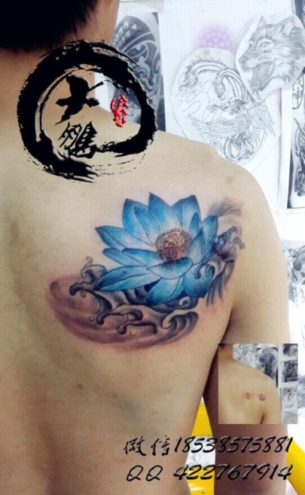 后肩彩色荷花纹身