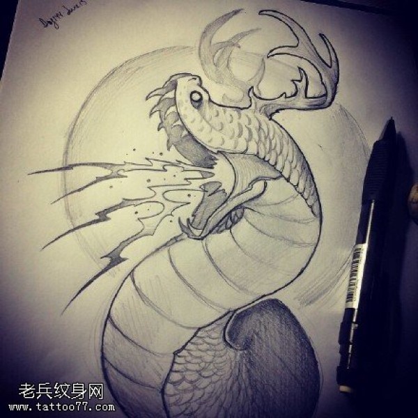 龙纹身手稿_一组老传统黑灰龙手稿纹身图案