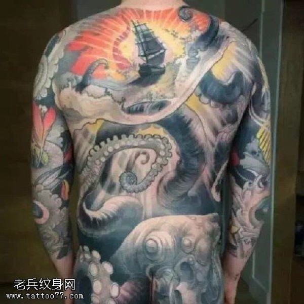 大型彩绘章鱼帆船纹身图案