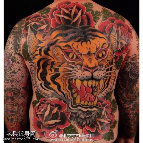 满背老虎玫瑰纹身图案