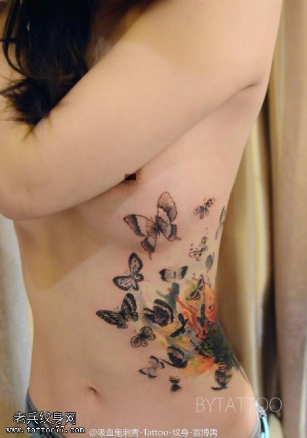 分享一款腰部时尚性感的蝶恋花纹身图案_腰部纹身图案大全_纹身图吧
