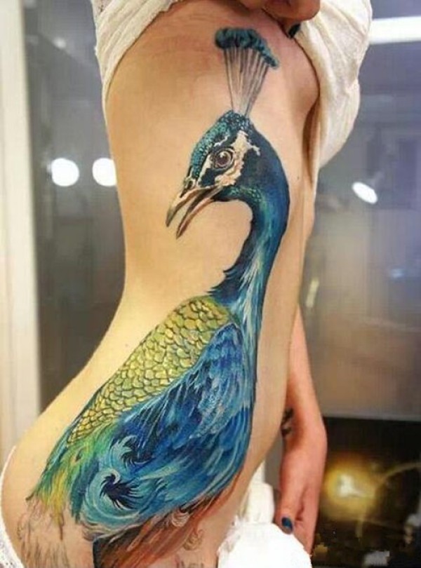 侧腰漂亮的孔雀纹身图案