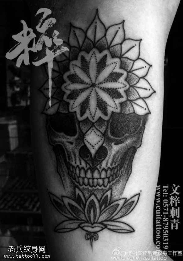 小腿莲花骷髅纹身图案