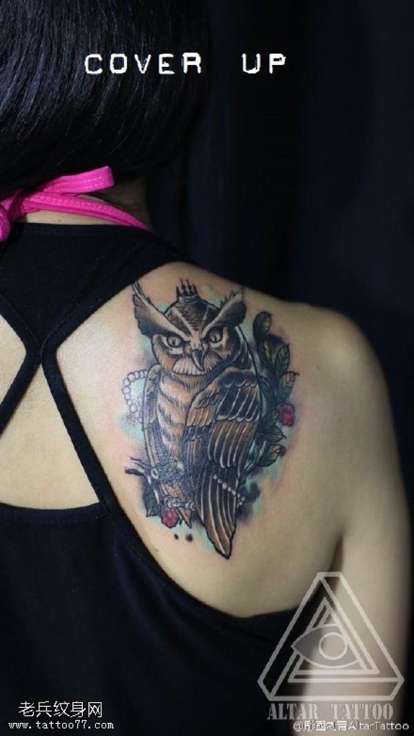 肩膀彩绘的猫头鹰纹身图案