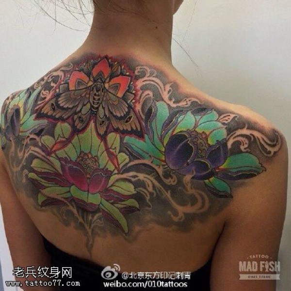 肩膀彩绘蝴蝶莲花纹身图案