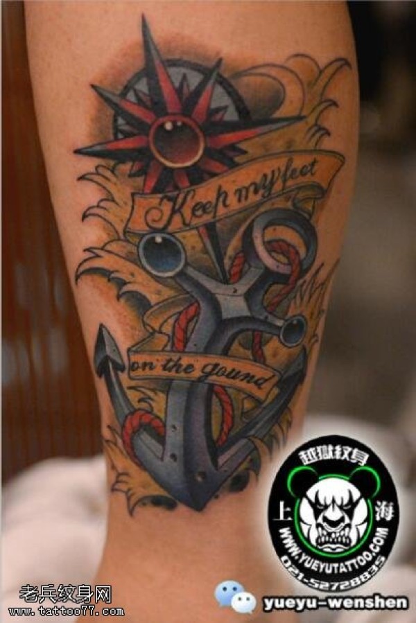 小腿的指南针船锚纹身图案