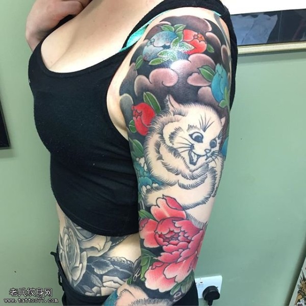 肩部白猫牡丹纹身图案