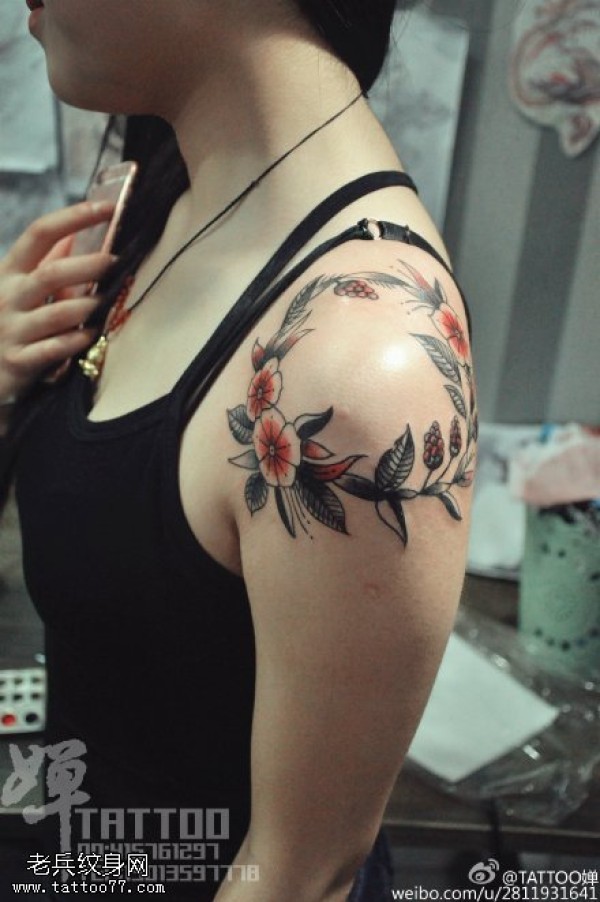 女生肩花纹身_15张女性双肩对称的肩花纹身图案作品图片