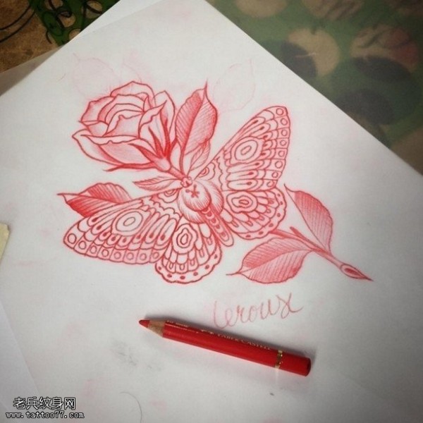 手稿素描蝴蝶玫瑰纹身图案