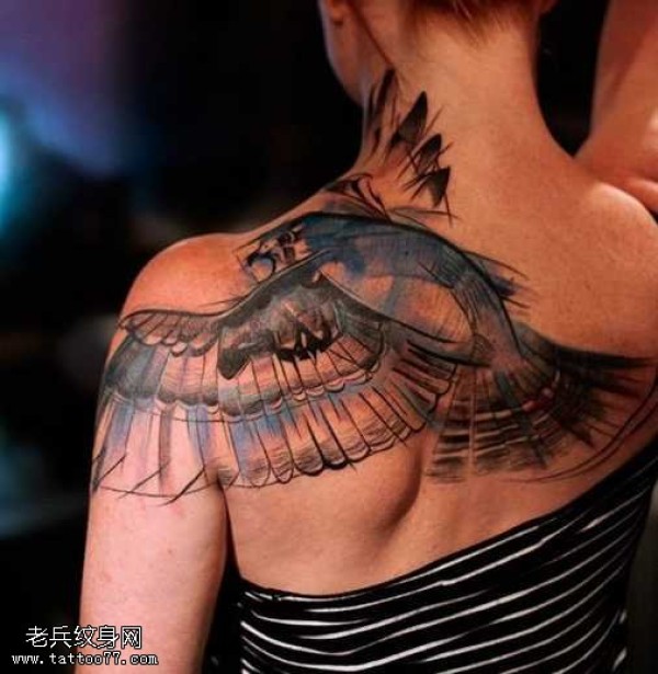 女生背部一只飞翔的大鸟纹身图案