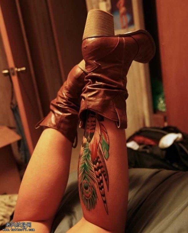 小腿部个性的羽毛纹身图案