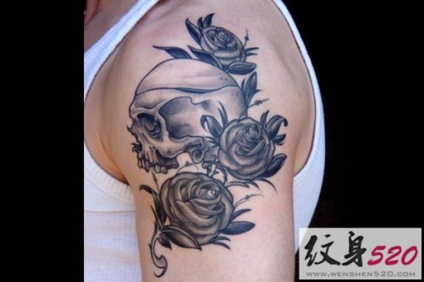 女生手臂经典潮流的骷髅与玫瑰花纹身图案