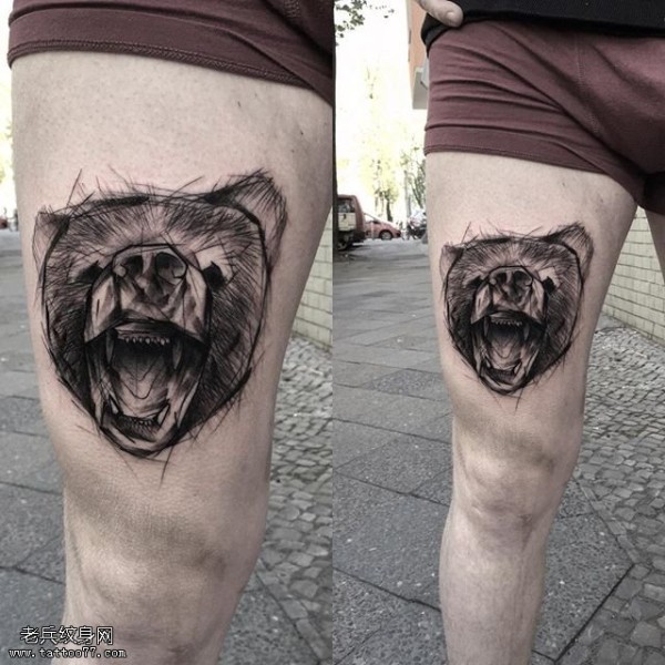 大腿线条狗熊纹身图案
