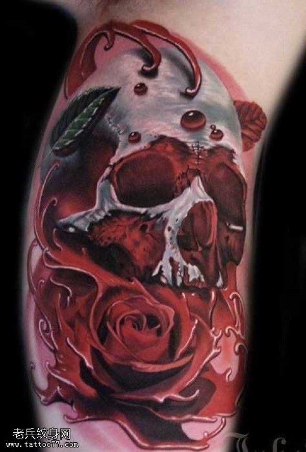 腿部潮流的骷髅玫瑰纹身图案
