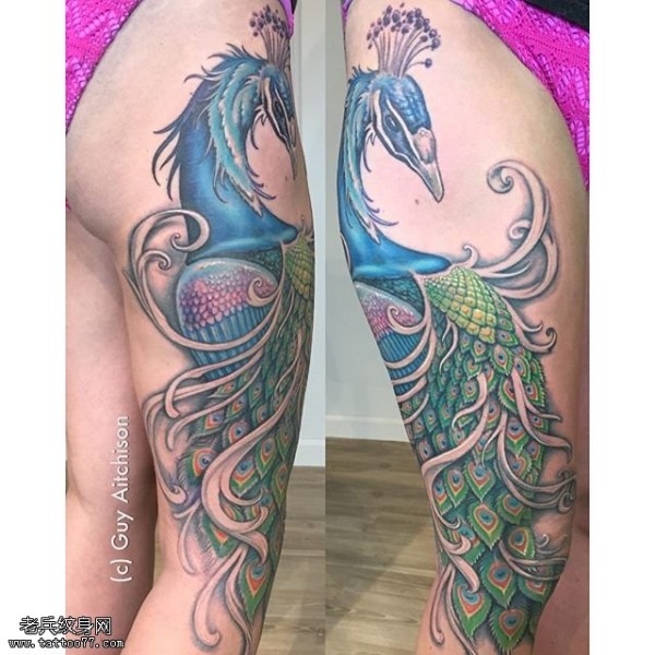 大腿彩色的孔雀纹身图案