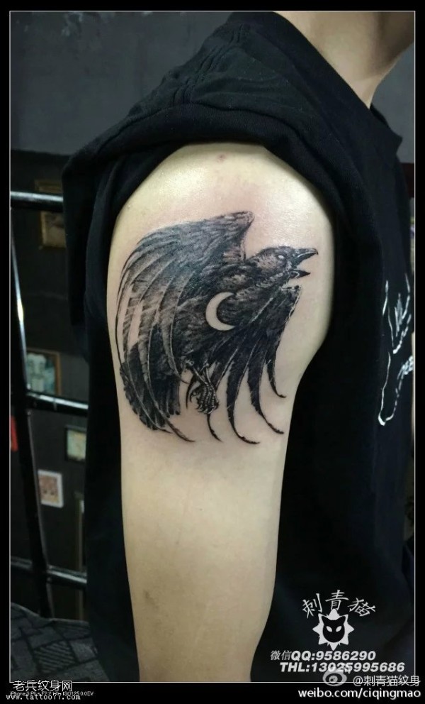 肩部点刺黑灰鹰纹身图案