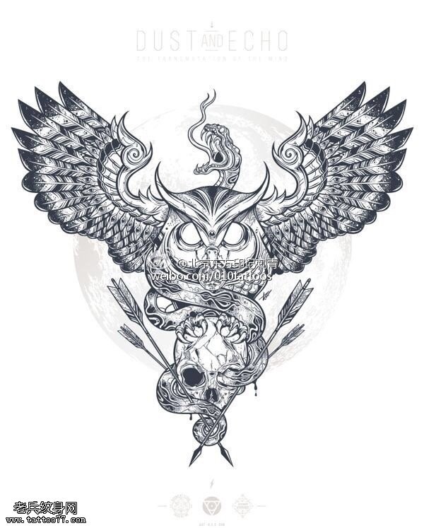 手稿蛇戏猫头鹰纹身图案