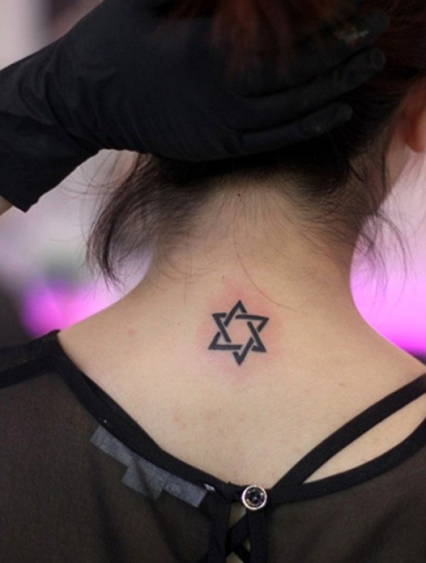 女生小巧精美的颈部六芒星纹身图案