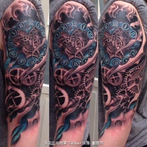 手臂纹上机械的彩绘纹身图案