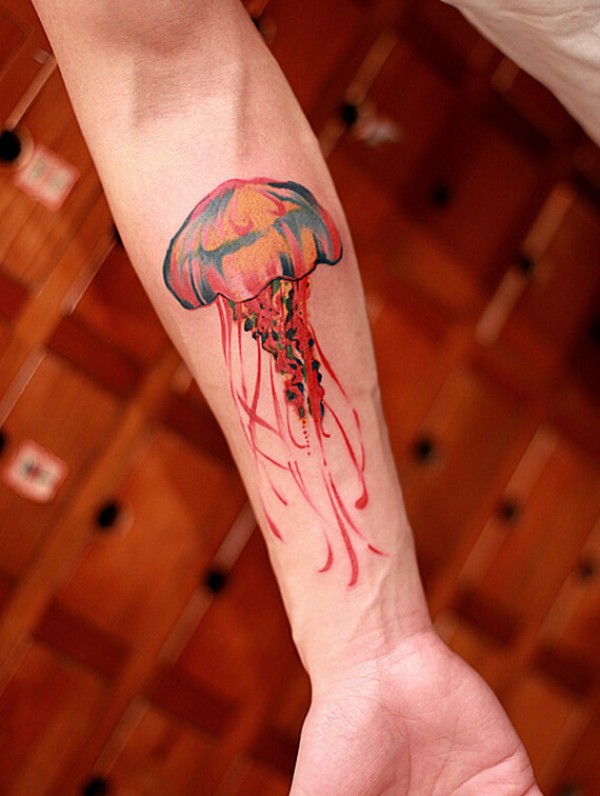女生手臂彩色水母纹身图案