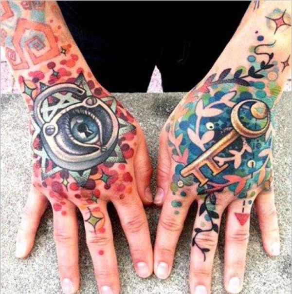 手背上独特西洋彩色纹身图案
