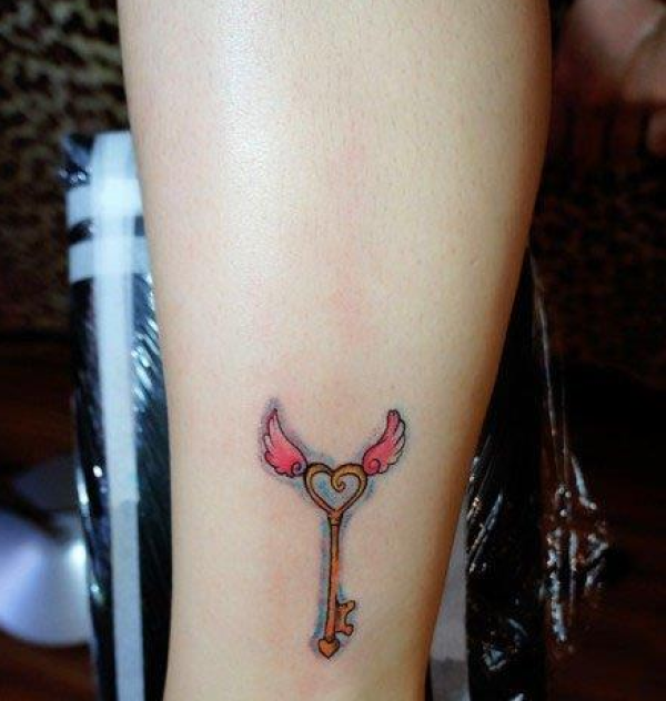 美女腿部小巧的翅膀与钥匙纹身图案