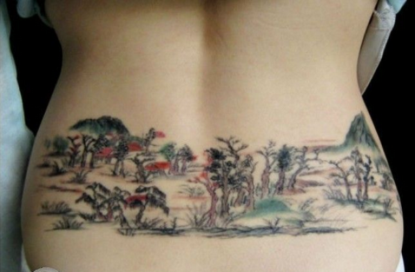 女生后腰纹身黑白灰风格抽象线条纹身图案