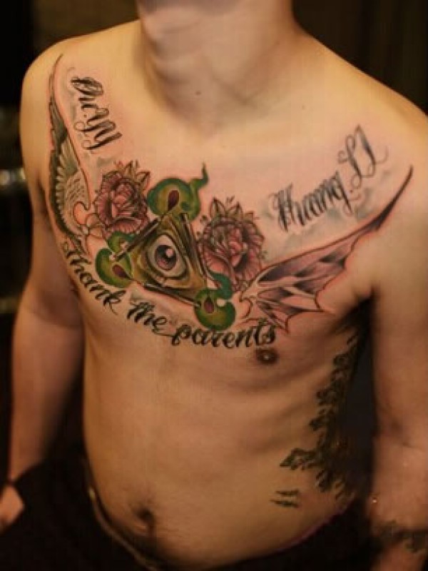 男士胸前带翅膀的上帝之眼纹身图案