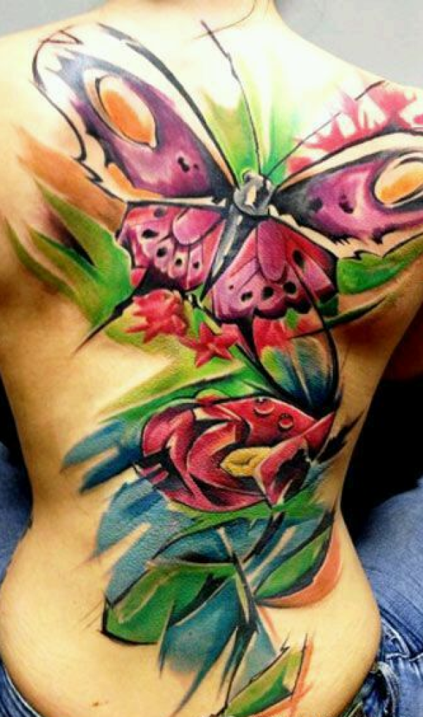 女生满背水墨蝴蝶和花纹身图案