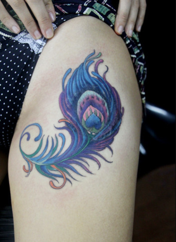 大腿唯美好看的孔雀羽毛纹身