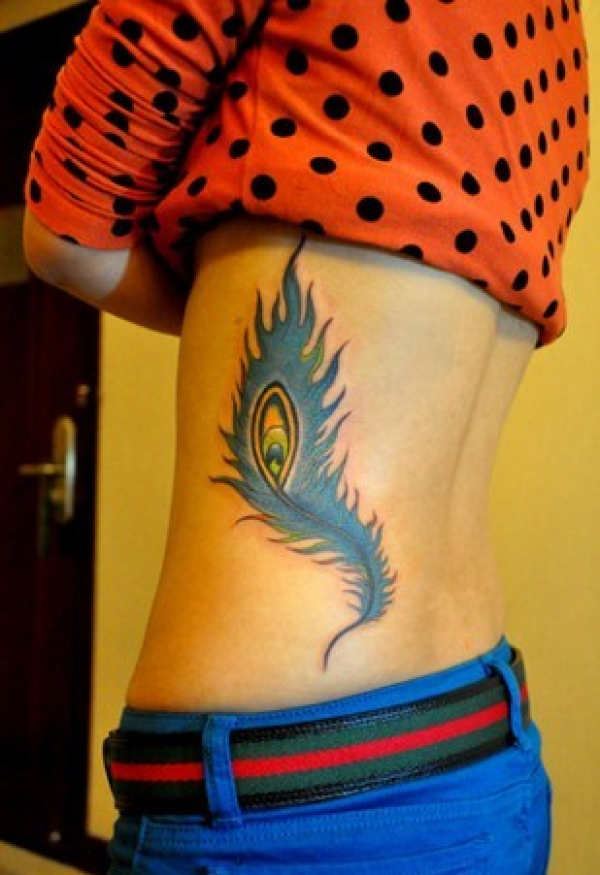 女生腰部蓝色的羽毛纹身图片