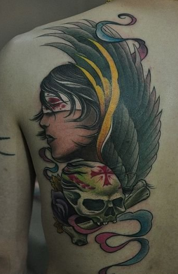 背部美女翅膀骷髅纹身