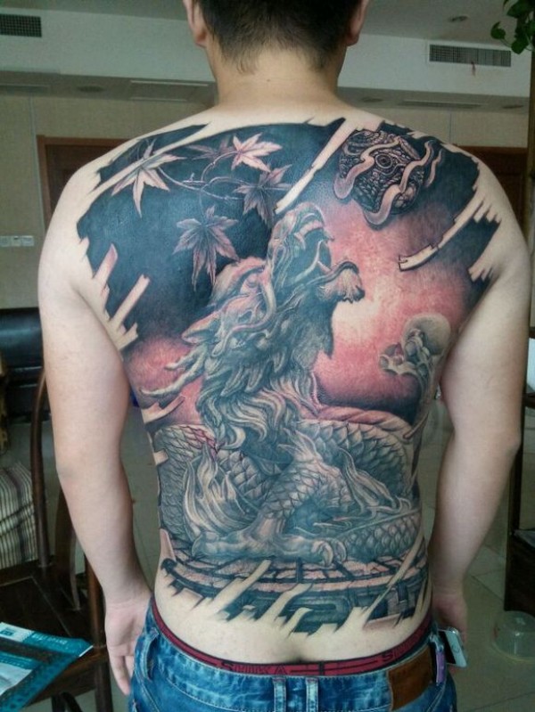 男士满背霸气的龙戏珠纹身